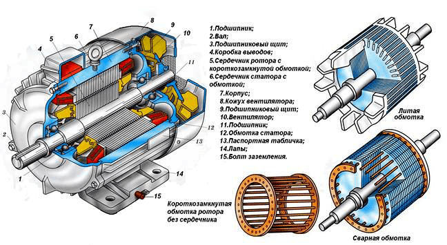 • изображение асинхронного двигателя с короткозамкнутым ротором в разрезе с указанием его элементов, мнемосхему, поясняющую принцип действия двигателя;