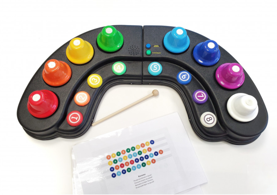 Каждый колокольчик соответствует ноте из гаммы (до, ре, ми, фа, соль, ля, си); колокольчики расположены в том же порядке, что и ноты в гамме (т.е. ноте до соответствует красный колокольчик и кнопка №1, ноте ре – оранжевый колокольчик и кнопка №2 и так далее.). Чтобы прозвучала определенная нота – необходимо нажать соответствующую кнопку.