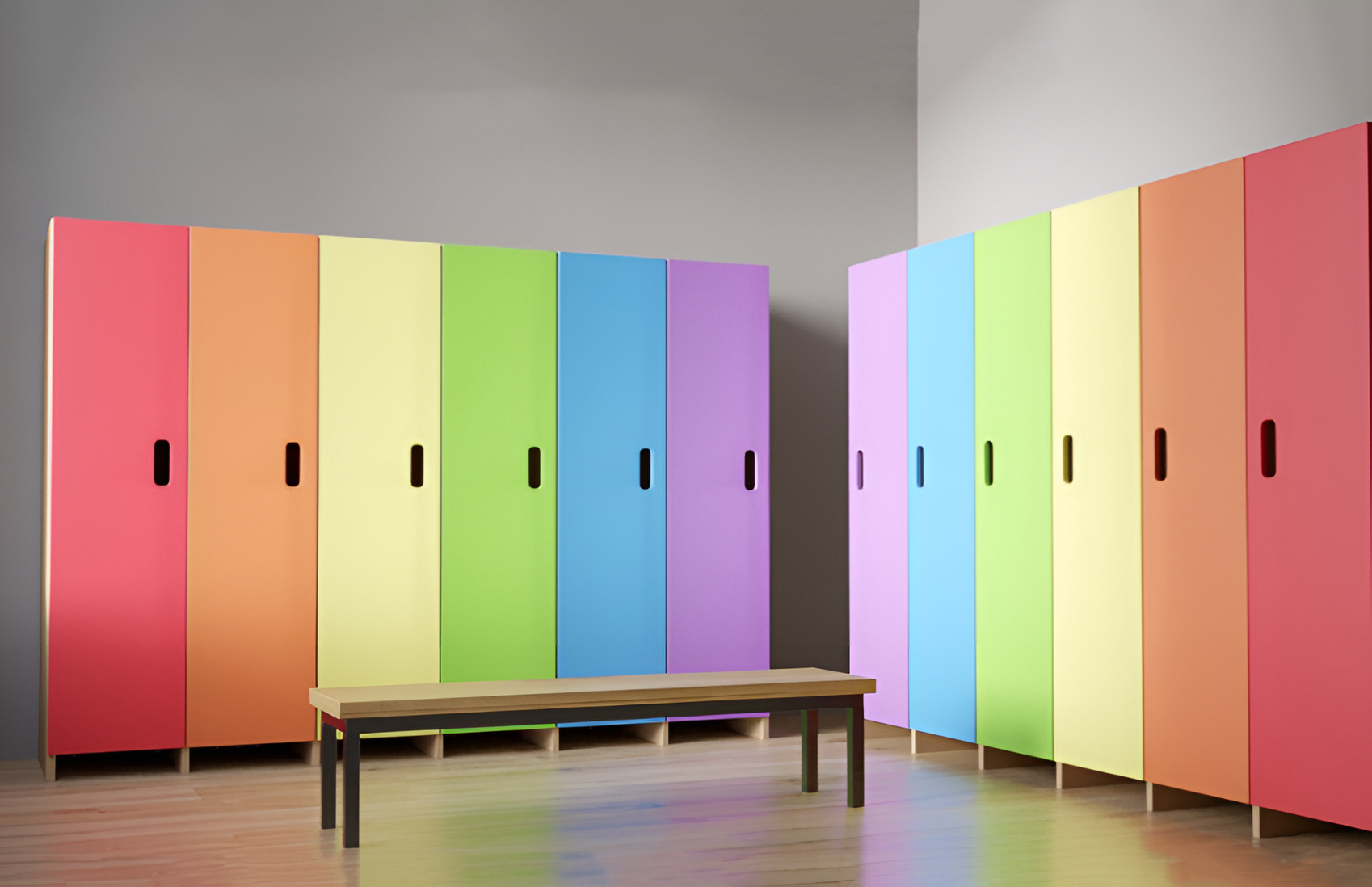 Детский гардероб — яркие стеллажи для детей разных возрастов, которые оснащены элементами в виде крючков и полок для складывания одежды и обуви. Дети могут самостоятельно, без помощи взрослых, складывать свои вещи в шкафчик, развивая самостоятельность. Данный гардероб «Радуга» выступает как специализированная мебель для детей, может стать прекрасным дополнением к полноценному гардеробу в интерьере детского центра, детского сада, а также подойдет для специальных школ и интернатов.