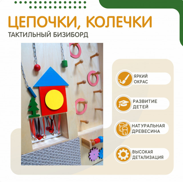 • Бизиборд с цепочками-колечками отлично подходит для игры как в домашней обстановке, так и в детских учреждениях.