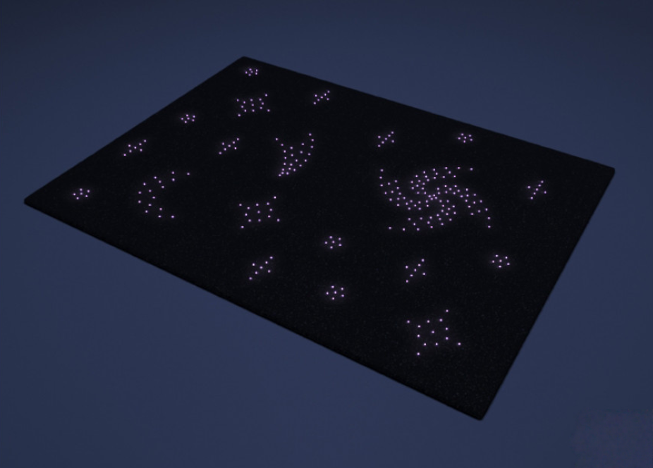Фибероптический ковер в виде звездного неба станет отличным дополнением в сенсорную комнату. С помощью этого изделия у детей развивается зрительная память, снимается стресс и поднимается настроение. Модуль выполнен из специального ковра, с обратной стороны ковра вставлены специальные волокна премиального качества, которые имитируют звезды. Одним из главных достоинств является мощный источник света, при котором волокна хорошо светятся даже днём, так что не обязательно затемнять комнату шторами. Изделие выполнено из натуральных материалов, и отвечает всем требованиям безопасности. В комплекте идет беспроводной пульт управления, переключающий режимы работы. Изделие поставляется в собранном виде в упаковке, предотвращающей повреждения при транспортировке. Возможны варианты настенного и напольного исполнения.