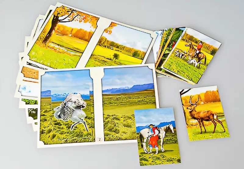 Игра состоит из 16-ти полноцветных игровых полей формата А5 и 32-х полноцветных карточек. Карточки и игровые поля изготовлены из картона и ламинированы пленкой.