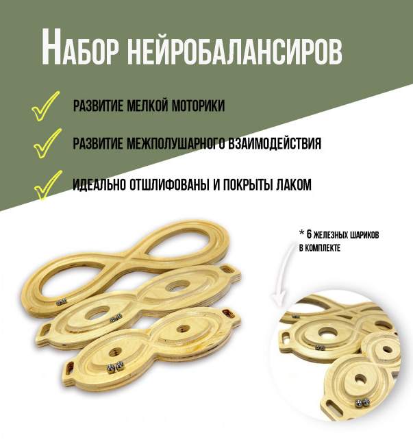 Набор из трех нейробалансиров в виде восьмерок - отличный способ развить у детей моторику, координацию и память. Игры с такими развивающими тренажерами прекрасно влияют на развитие детей разных возрастов и подготовки. Нейробалансир представляет собой хорошо известную игру. В ней детям будет необходимо перемещать металлические шарики по специальным дорожкам, используя баланс, моторику и координацию. В процессе игр у малышей будут развиваться такие важные навыки как координация, моторика, память и мышление. Каждый балансир из этого набора представляет собой фигуру в виде знака бесконечности. На каждой из дорожек находится два металлических шарика, которые детям необходимо перемешать. Вы сможете придумать множество интересных и веселых игр с соревновательным моментом, чтобы малышам было еще увлекательнее играть. Такой набор будет незаменимым на групповых занятиях в различных учреждениях образования или для домашних развивающих игр. Каждый нейробалансир из данного комплекта изготовлен из качественной древесины, которая идеально отшлифована и покрыта лаком.