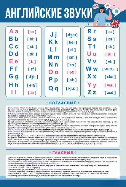 Стенд представляет собой панель, на которой размещена информация к уроку английского языка. Гласные и согласные звуки выделены разными цветами.