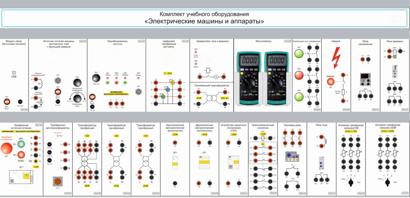 Комплект лабораторного оборудования «Электрические машины и аппараты» предназначен для проведения лабораторно-практических занятий в учреждениях начального профессионального, среднего профессионального и высшего профессионального образования, для получения базовых и углубленных профессиональных знаний, и навыков.